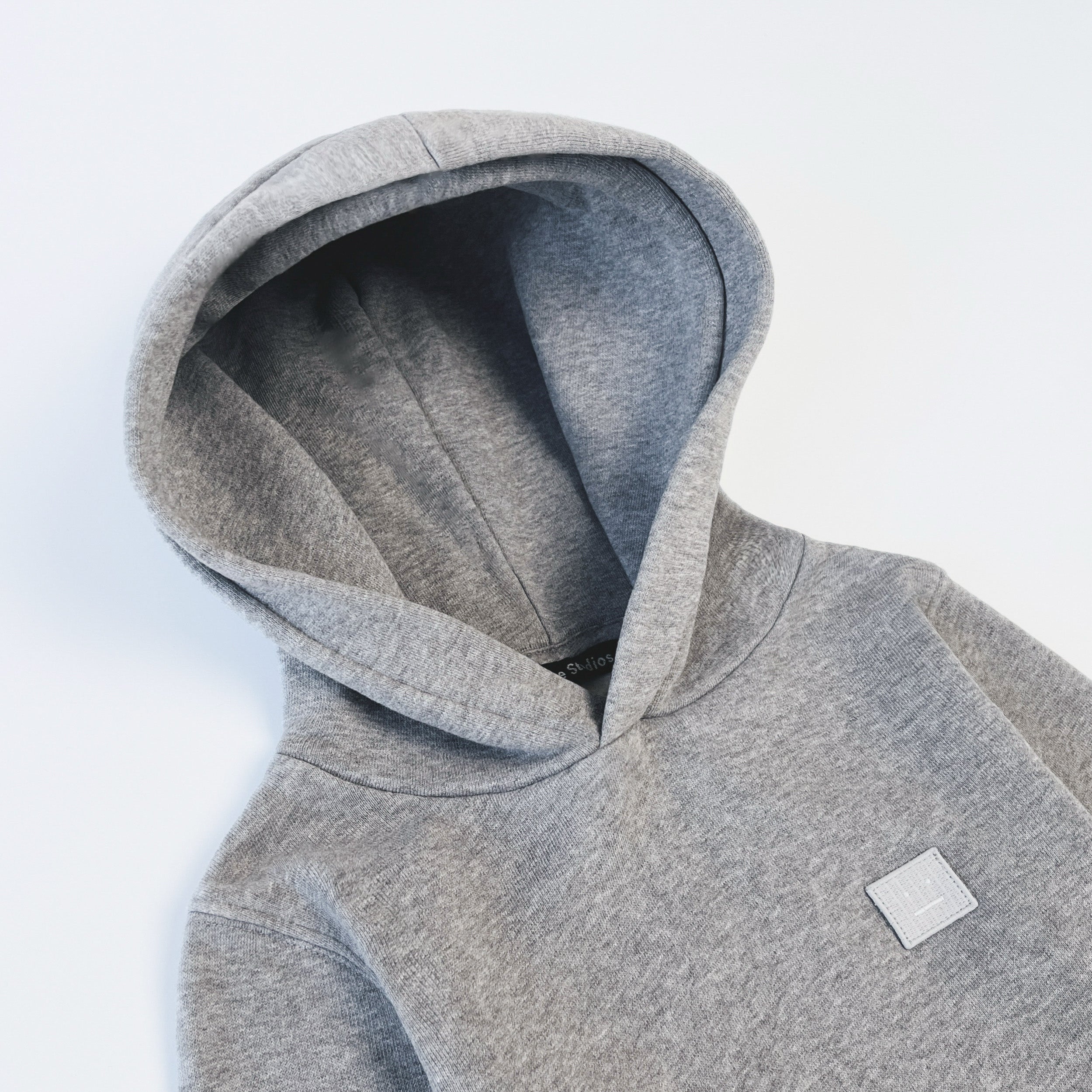 Acne Studios Mini Ferris pull over Hoody in grey melange. Comprised of soft cotton jersey with a fleece lined interior. Featuring the iconic Face patch, ribbed cuffs, hem and font kangaroo pocket.