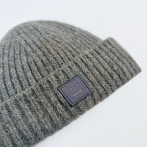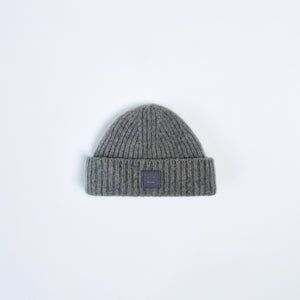 Chunky woollen knit beanie hat by Acne Studios featuring a small, embroidered face logo patch, ribbed detailing and upturned edge.