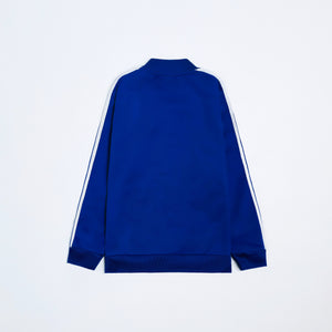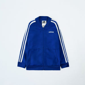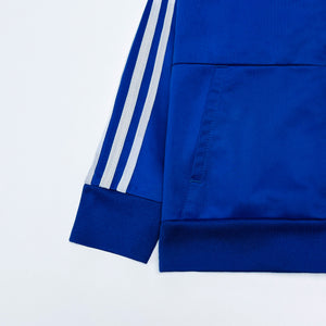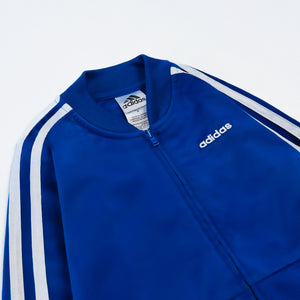 adidas tracksuit top in blue. Featuring adidas logo and three stripes detailing. Zip front with pockets, ribbed collar, cuffs and hem.