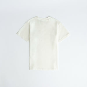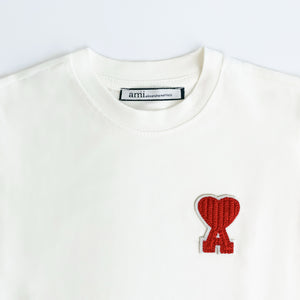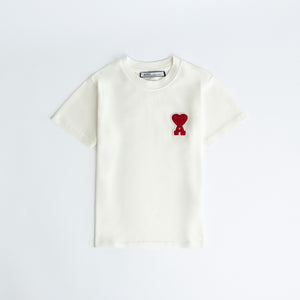 Unisex kids Ami de Coeur monogram motif t-shirt in cream, from AMI Paris. Featuring their signature red embroidered logo on the front. Made of organic cotton and designed with a crew neck, short sleeves and straight hem.