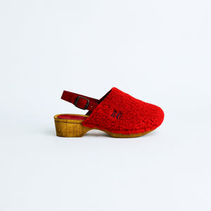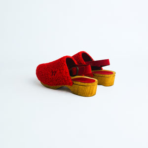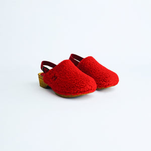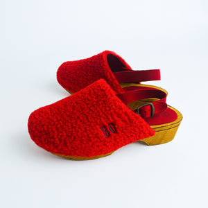 Shearling clogs in red by Bobo Choses. Designed with a faux-fur upper, contrasting navy embroidered brand logo and top stitching. Fastened with a sliding buckled back strap. The clogs have a round toe and feature a wooden sole with a square heel.