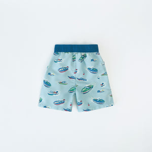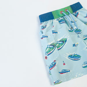 Cath Kids swim shorts in blue with nautical boat print. Featuring navy elasticated waistband, front contrasting green panel with ties and Velcro fastening side pocket.