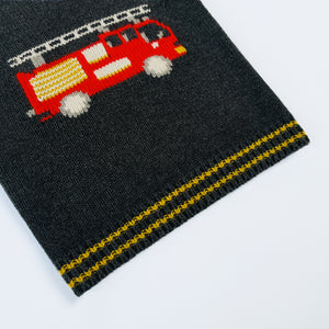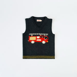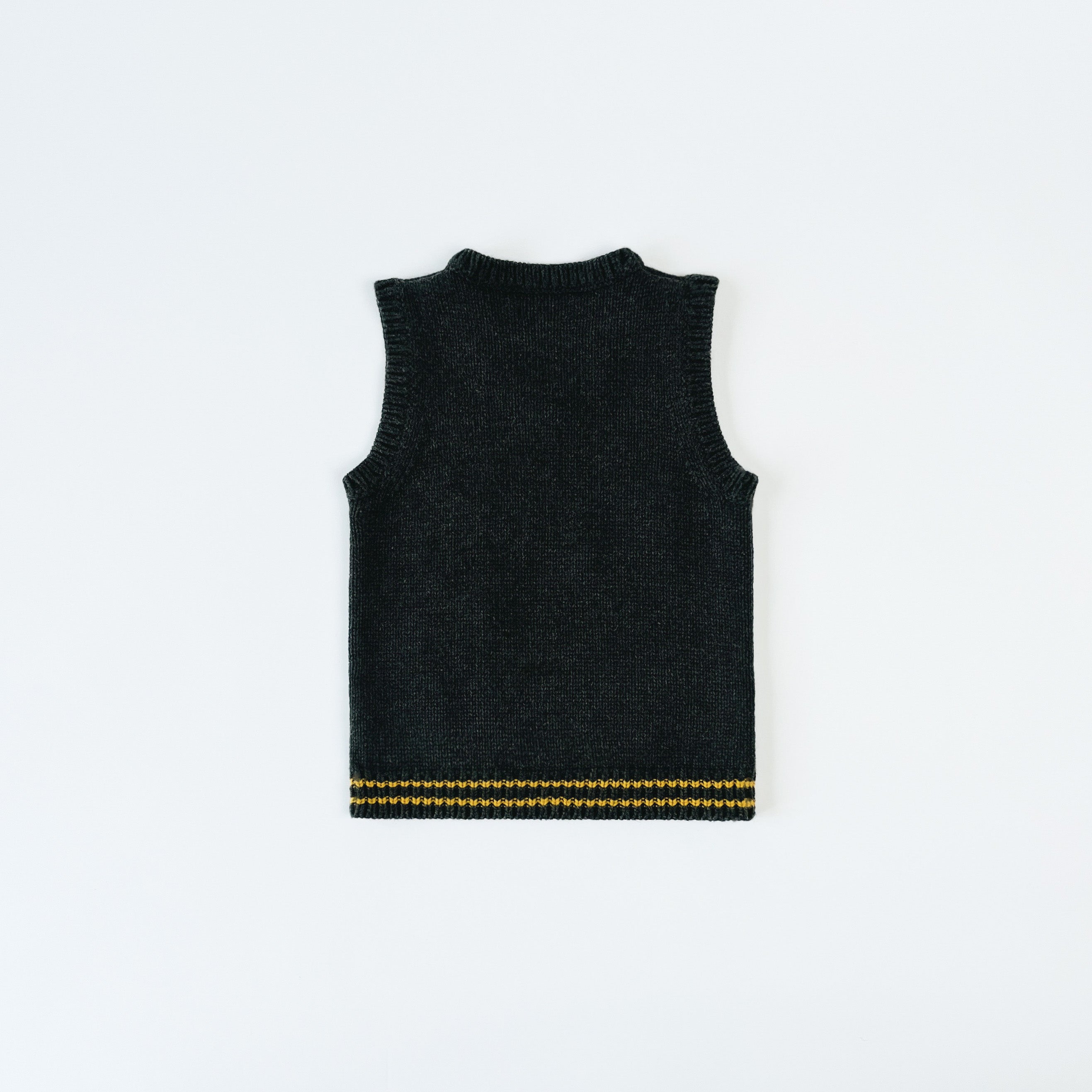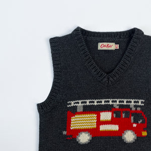 Cath Kids knitted tank top in charcoal grey, with fire engine detail. Designed with a V-neck, ribbed shoulders and hem with contrasting mustard yellow stitching.