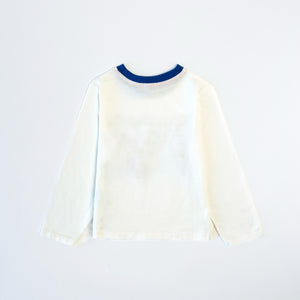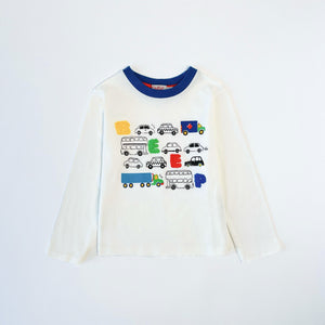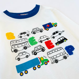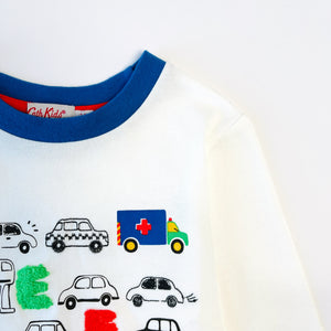 Cath Kids long sleeve t-shirt in white with transport detail and textured ‘Beep” writing.