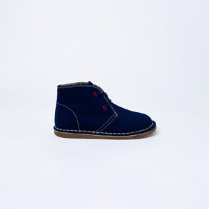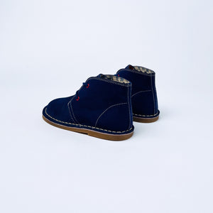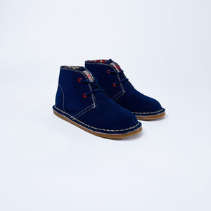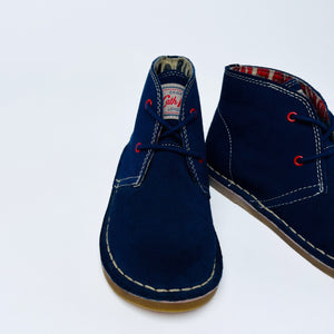 Cath Kidston x Clarks Originals classic desert boots in navy suede. Featuring contrasting red eyelets and signature Cath Kidston repeat pattern lining in a solider design.