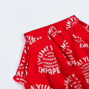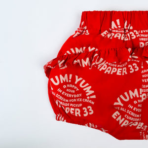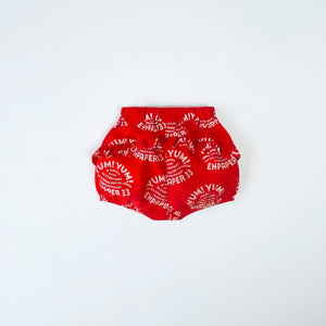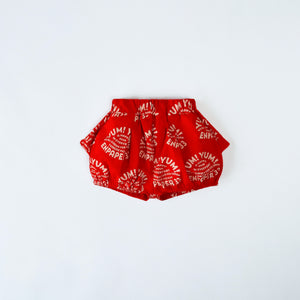 Logo bloomer shorts by Korean brand EN:PAPER in tomato red. From the SS23 ‘My Colour ‘collection. Featuring an elasticated waist band, side pockets and ruffle detailing across the back.