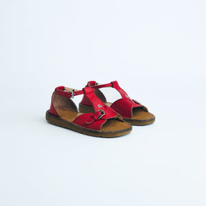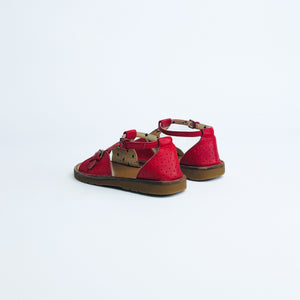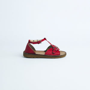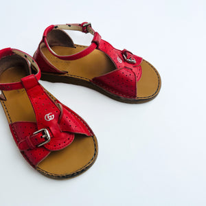 Sandals in cherry red by Gucci. Designed with an adjustable toe buckle, ankle strap and heel cup. Featuring star print on the interior leather, engraved branding on the buckles and the Double G Logo on the front of each strap. There is contrast stitching on the leather foot bed with an outer rubberised layer for additional sole grip.