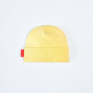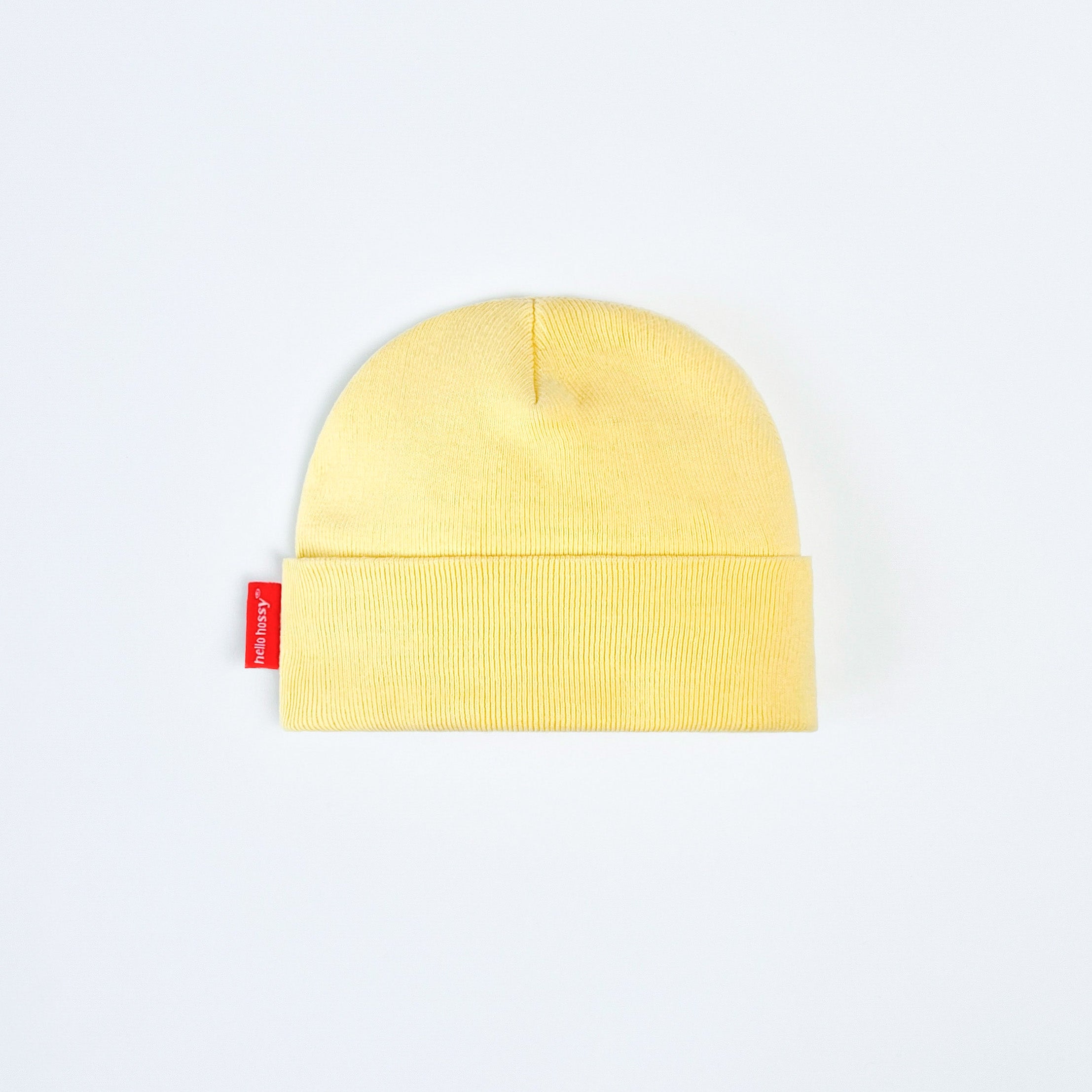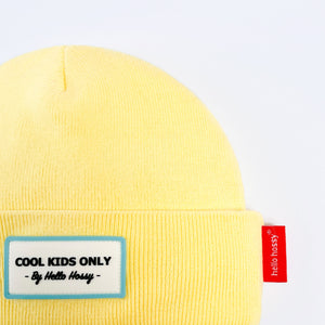 Cotton Urban Chiné knit beanie hat in lemon from Hello Hossy. Featuring a mottled effect, ‘Cool Kids Only’ patch on the front and signature band label on left side seam.