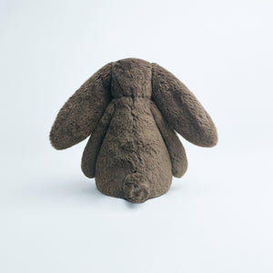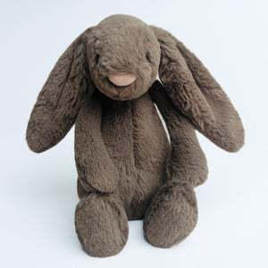 Bashful Truffle Bunny by Jellycat London,in size small. Soft to the touch with luxurious grey-brown plush hair, a pink nose and long floppy ears. Note, the Bashful Truffle Bunny has been retired by the brand.
