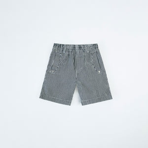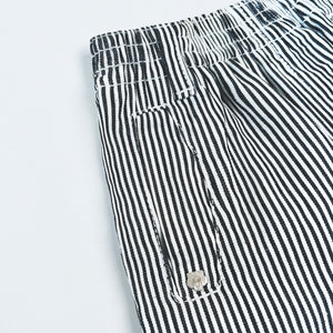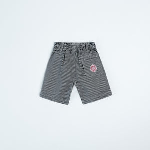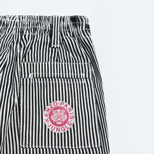 Black and White striped cotton shorts by Kenzo. Featuring front pockets with metal lion detailing below and the brands logo patch in red on the reverse. Designed with an elasticated waistband.