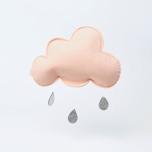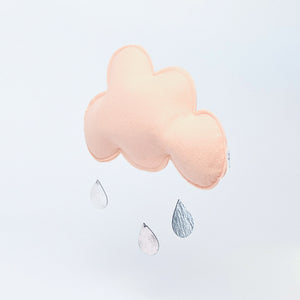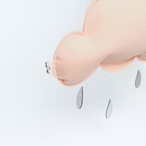 Felt single cloud mobile in dust pink, by Copenhagen brand Kønges Slojd. Featuring Faux leather silver rain drops and invisible string to hang the mobile. Made with sustainable environmentally friendly materials.