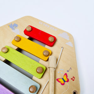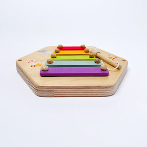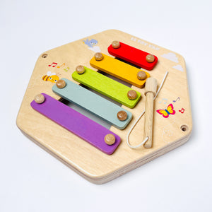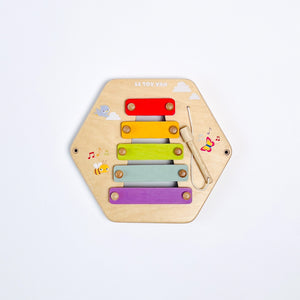 Wooden hexagon shaped activity ‘deco play’ xylophone by Le Toy Van. Featuring rainbow-coloured keys, this xylophone can be wall mounted or played on a tabletop.