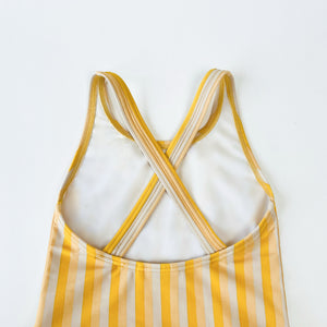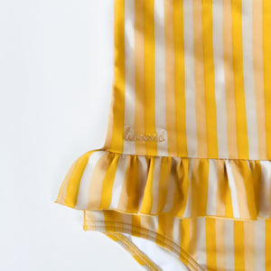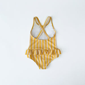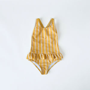Liewood Amara swimsuit in peach, sand and yellow stripes. Featuring embroidered Liewood logo, ruffle detailing at the waist and crossed back straps. Lined and made from recycled polyester This swimsuit offers UPF 50+ protection.
