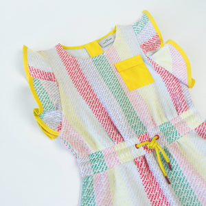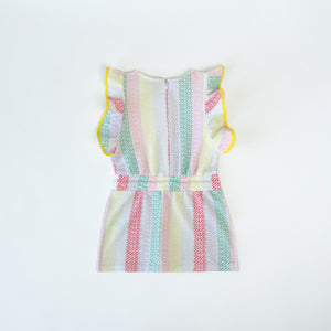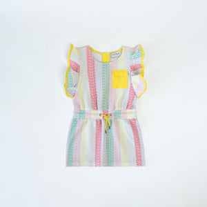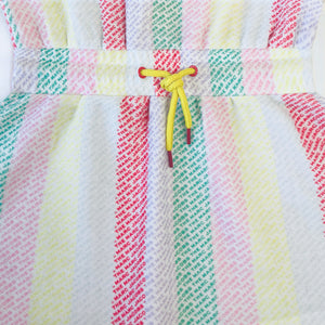 Soft organic cotton jersey dress by Marc Jacobs, featuring rainbow logo print throughout. Detailed with trimmed ruffle sleeves, contrasting yellow front pocket and interior panelling. With the addition of a concealed zip back fastening and elasticated drawstring waist, with yellow cord ties. NB no size label on garment, sizing was determined in accordance with Marc Jacobs measurement charts.