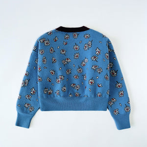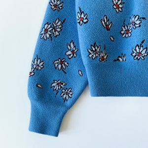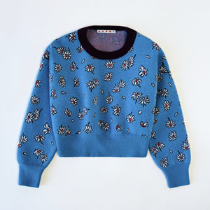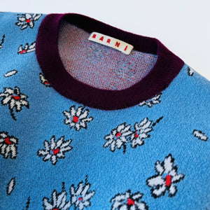 Marni knitted jumper in blue with repetitive daisy detail, oversized sleeves and maroon neckline.