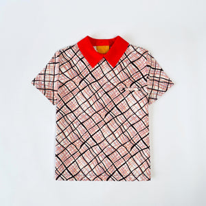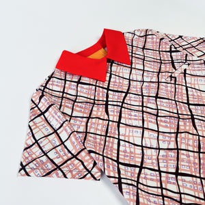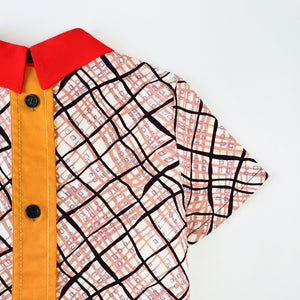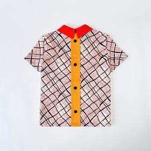 Marni kids’ collection graphic grid pattern top with contrasting bright red collar, black button fastening on a mustard yellow placket on the back and jetted pocket on the front.