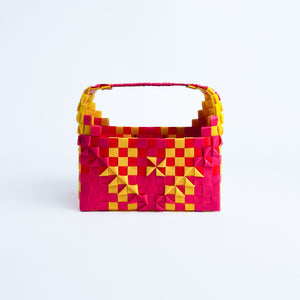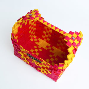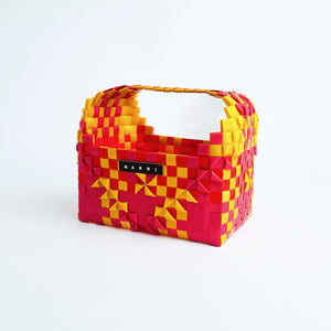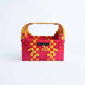 Handwoven textured tote bag in yellow, pink and red by Marni. Featuring a fixed carry handle, silver-tone hardware and a leather logo patch in black and white.