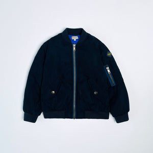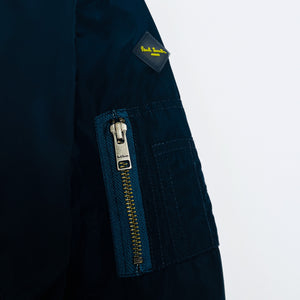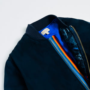 Paul Smith Junior Malcolm bomber jacket in navy. Featuring branded rubber patch on sleeve, press stud with zip fastening and contrast lining.