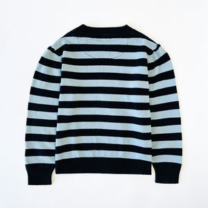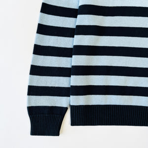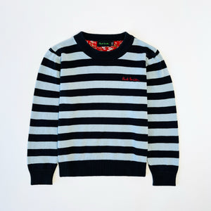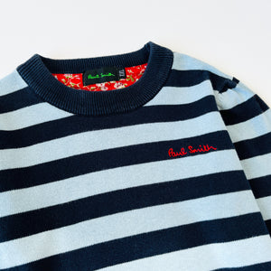 Paul Smith jumper with navy and light blue strips and embroidered logo in red.