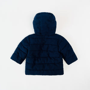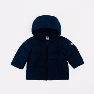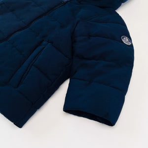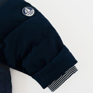 Navy padded coat with hood by Petit Bateau. Featuring fleece lining, contrast striped cuffs, front pockets, zip closure and badge on left sleeve.