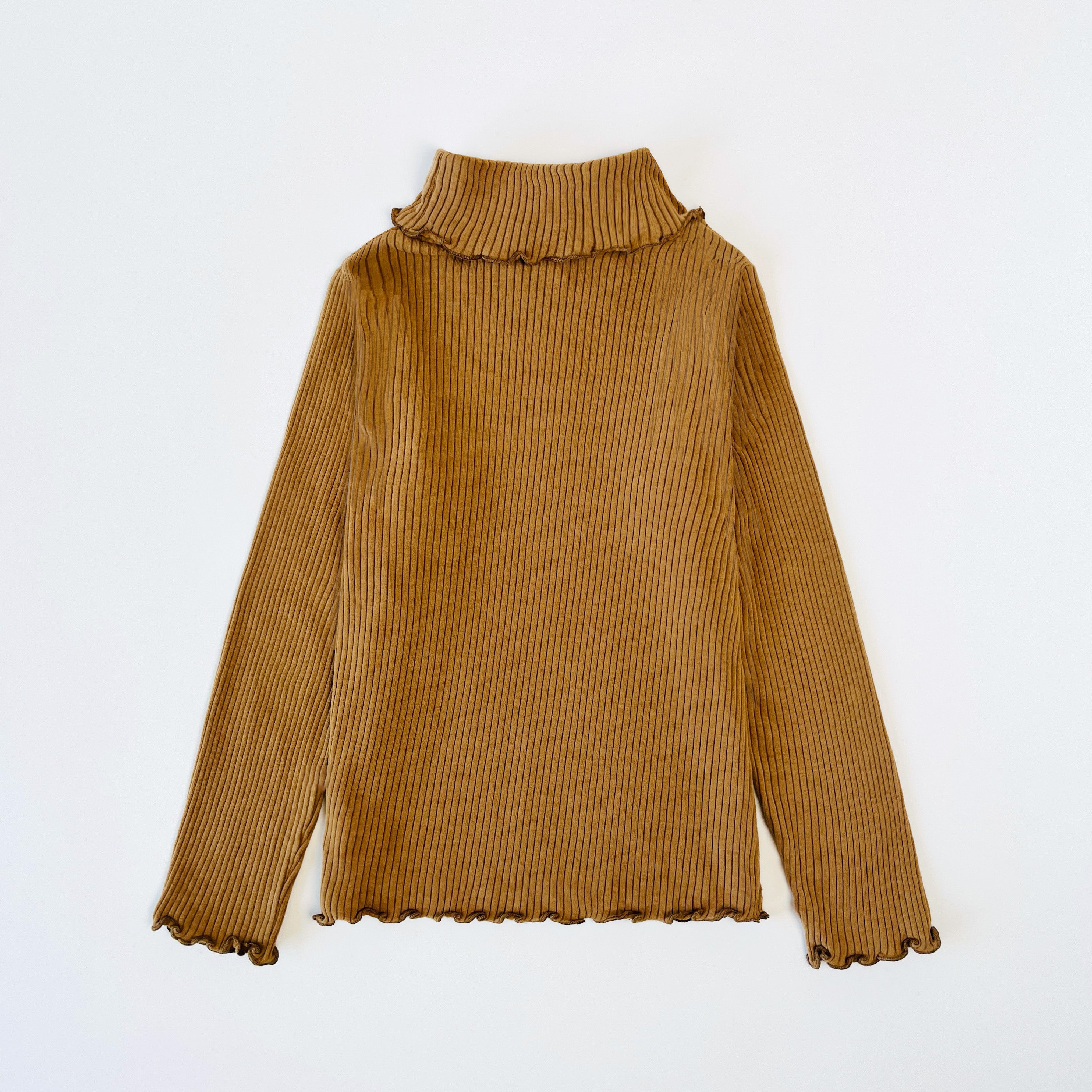 Petit Bateau ribbed roll neck top in brown/gold with logo motif and scalloped hem detail.