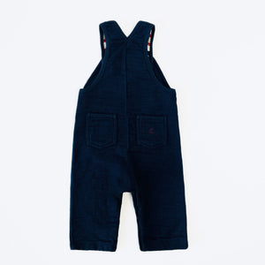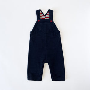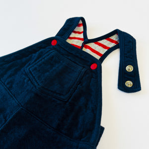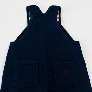 Petit Bateau navy dungarees with striped interior lining and red logo button fastening. Features adjustable fastening with room for growth and button opening at inner legs.