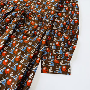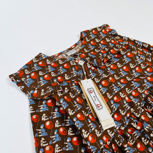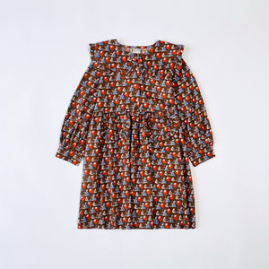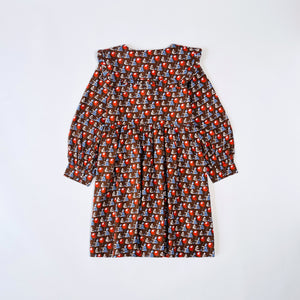 Dress from Shrimps x Label/Mix 2021 collection for Next. Featuring a repetitive pattern of child holding a balloon and teddy bear, oversized collar, button front, cuffs and ruffle trim pockets.