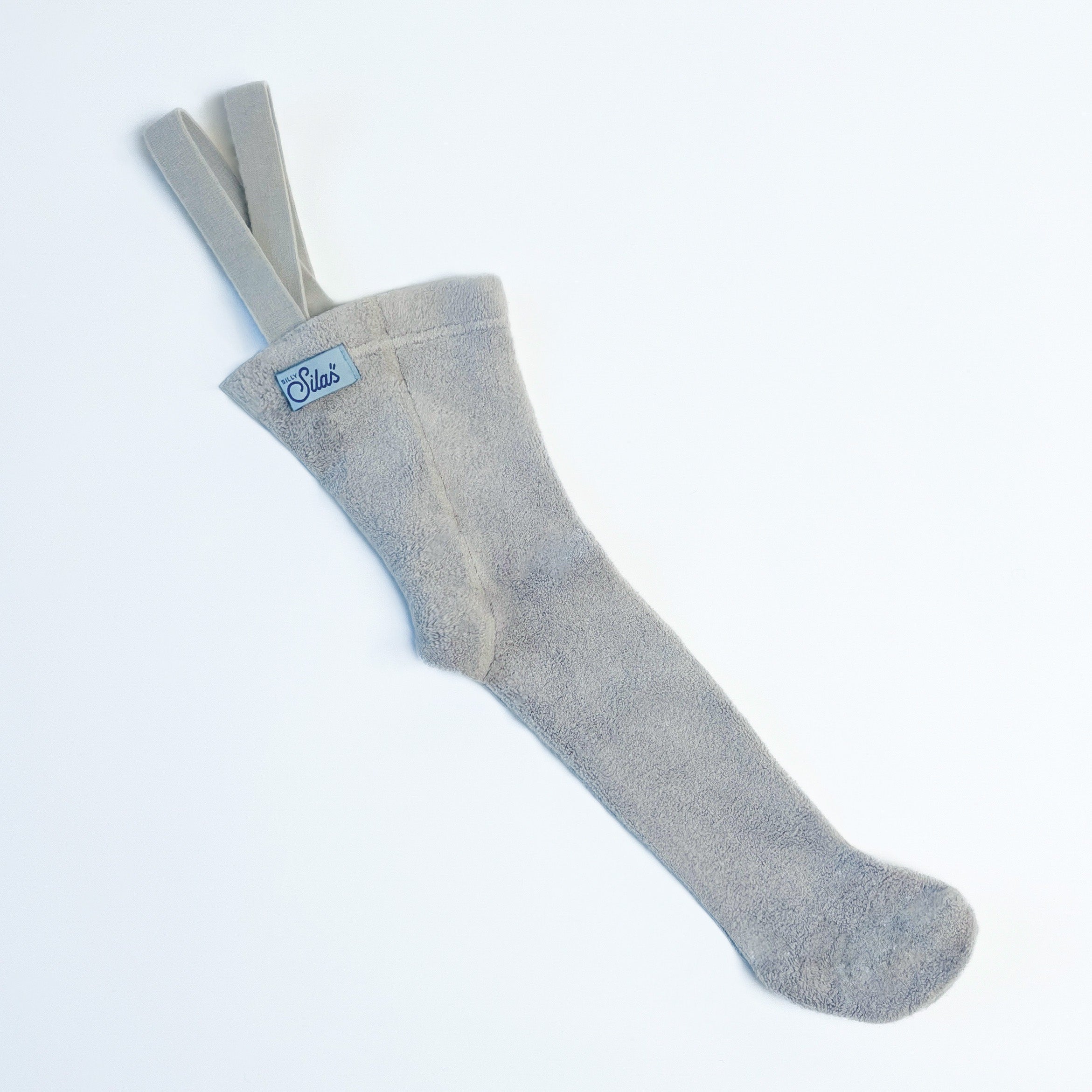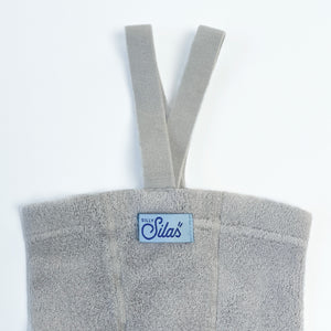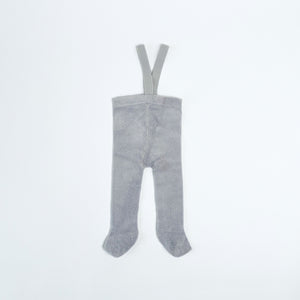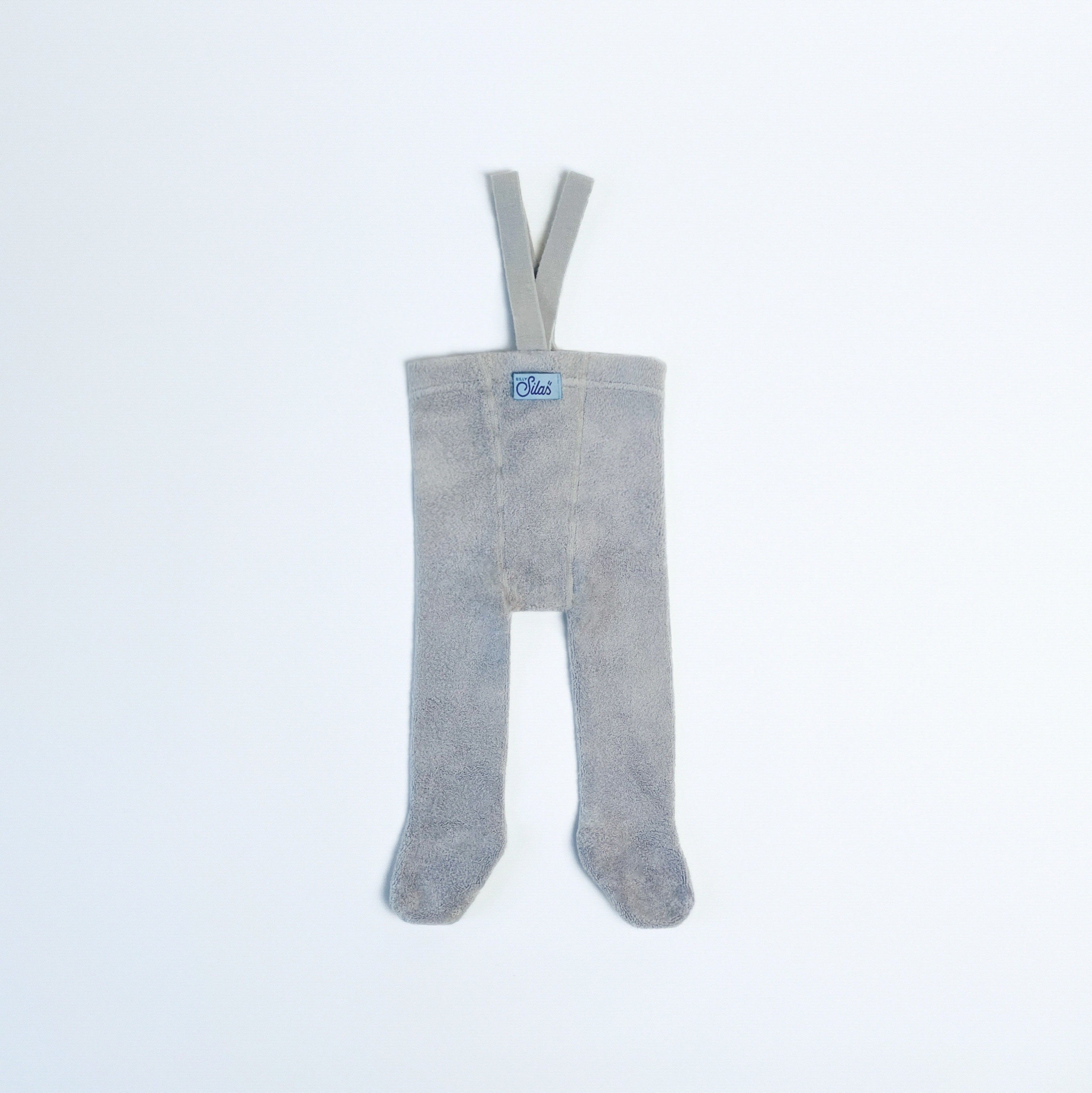 Silly Silas footed Teddy Tights with braces in Pearl grey. Made of a soft organic cotton and recycled polyamide, with a teddy bear look. Designed with the teddy texture on the exterior and a gently brushed interior. The Silly Silas Brand Label is stitched on the reverse.
