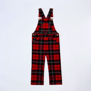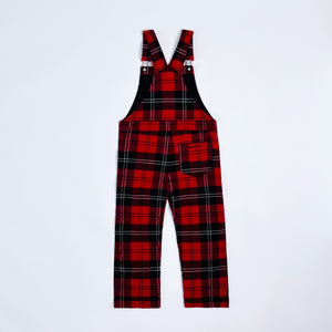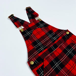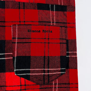 Tartan dungarees from Simone Rocha’s 2021 collection for H&M. Featuring textured cotton, branded gold buttons and buckles. Popper button opening at sides, turned up hems and brand name embroidered in black on back right pocket.