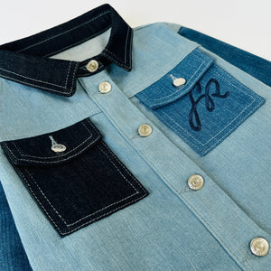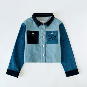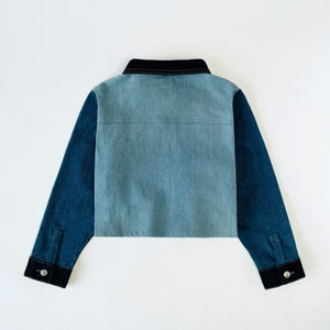 Sonia Rykiel kids’ collection denim jacket with contrasting pockets, collar, cuffs and logo detail.