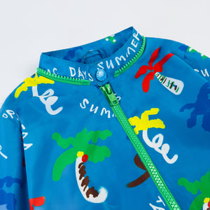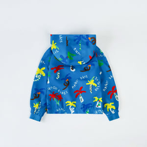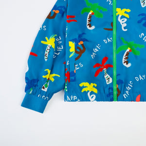 Blue windbreaker jacket by Stella McCartney Kids, featuring multi-coloured ‘Good Vibes’ slogans and palm tree print. Made of recycled materials and designed with a detachable hood, exposed contrasting green zip and front pockets. There is an embossed popper button at the neckline, ribbed cuffs, and an elasticated hem. The interior of the jacket is lined with soft organic cotton.