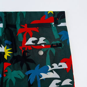 Stella McCartney Kids green Bermuda shorts, with colourful palm tree print. Constructed of light weight sustainable cotton. Featuring a zip, hook and eye fastening, adjustable waistband, popper buttons on the back pockets and Stella McCartney placket on the reverse.