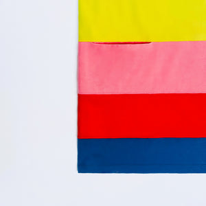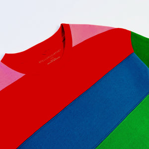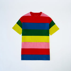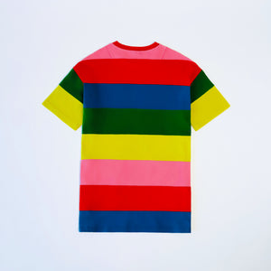 Stella McCartney Kids rainbow t-shirt dress. Featuring short sleeves, box fit and horizontal coloured block stripes. Comprised of sustainable cotton jersey.