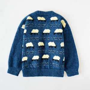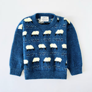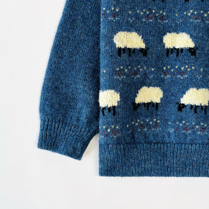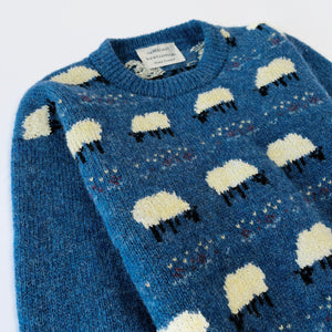 Willow Knitwear woollen jumper in blue with repetitive sheep pattern.