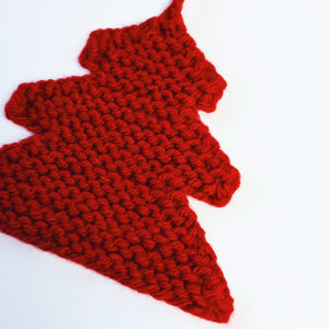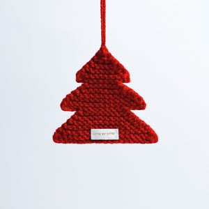 Hand knitted seasonal tree decoration by lyttle stór. Made of soft red wool in the shape of a Christmas tree.