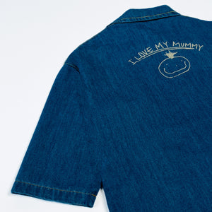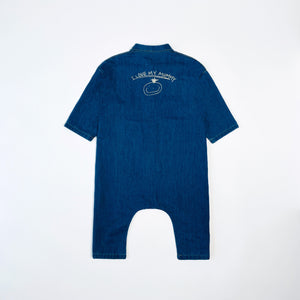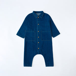 Oversized fit all in one denim overalls, with button opening at front, large workwear style pockets and a rounded drop crotch. Can be worn with sleeves and hems turned up. On the back is a handwritten print ‘I love my mummy’ with a smiley face.